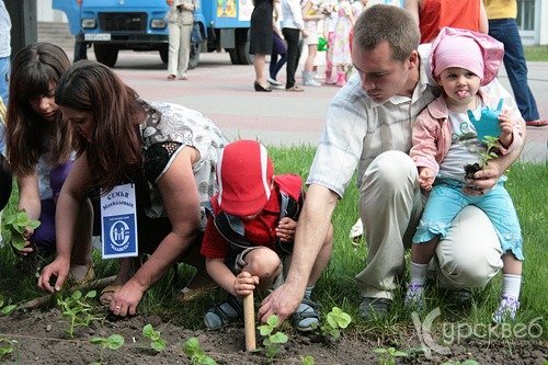 Когда же пришло время высаживать цветы, все семьи дружно принялись за это почётное и благородное занятие. Дети увлечённо копали ямки для саженцев, а мамы и папы бережно сажали их в землю. Совместный процесс посадки маленьких зелёных росточков доставил всем огромное удовольствие, ведь скоро они прорастут и будут радовать курян. Наблюдая за тем, как задорно и весело, с каким интересом и трудолюбием дети облагораживали этот небольшой клочок земли, в который раз убеждаешься в том, что дети и есть эти самые цветы, которые украшают и облагораживают нашу жизнь. А украшением новой семейной клумбы стали разноцветные детские ладошки, вырезанные из бумаги, с нарисованными на них такими же детскими пожеланиями – добра, счастья, мира.