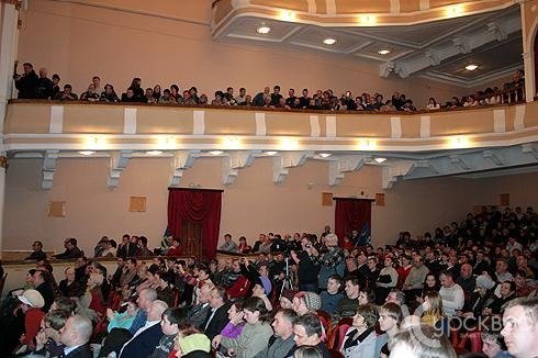 После прошла встреча с избирателями, большой зал филармонии был забит до отказа, многие стояли. Владимира Вольфовича встречали оглушительными аплодисментами. Лидер ЛДПР больше часа отвечал на записки из зала, курян интересовали самые разнообразные вопросы, начиная от маленьких пенсий, детских пособий, проблем сельского хозяйства и заканчивая международной политикой. Личных вопросов практически не было, за исключением футбольных симпатий политика, на что Жириновский, поинтересовашись у однопартийца Сергея Иванова, какая команда представляет Соловьиный край, моментально выдал курский "Авангард" - зал ответил одобрительными аплодисментами.