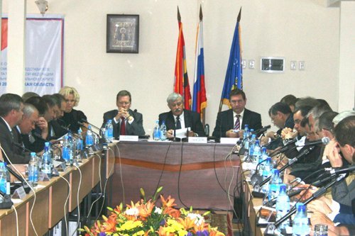 Заседание началось, как и было запланировано, ровно в 10. Обсуждали приоритеты долгосрочного развития регионов ЦФО: последствия мирового финансово-экономического кризиса и посткризисные корректировки. Первым выступил Георгий Полтавченко. Он рассказал, что если в целом с начала кризисных явлений в мире объёмы производства сократились на 3-4 процента, то в России эта цифра составила 8 процентов. Что касается Центрального федерального округа, то в 12 регионах падение производства оказалось выше, чем в среднем по России. Но два региона округа за первые четыре месяца показали рост производства: это Калужская и Белгородская области - 14,9% и 1% соответственно.
