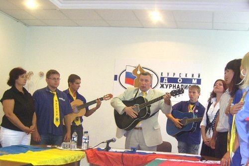 После слов Александра Трубникова, все присутствовавшие участники форума во главе со своим руководителем под гитары спели гимн центра «Монолит».