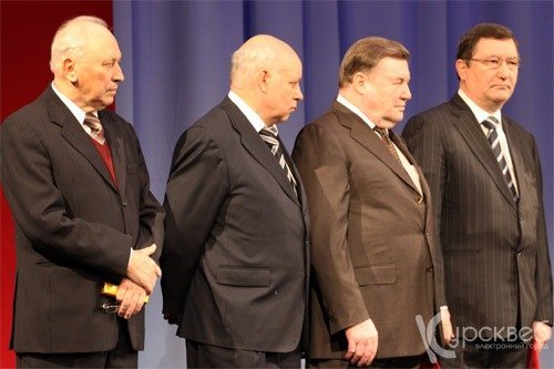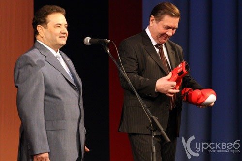 От муниципальных районов и городских округов губернатора поздравили глава администрации г. Курска Николай Овчаров и глава Мантуровского района Василий Денисов, от предприятий – президент Курского областного Союза промышленников и предпринимателей Александр Ягерь, председатель Совета ассоциации крестьянских (фермерских) хозяйств и сельхозкооперативов Сергей Бочаров и председатель Федерации профсоюзных организаций Игорь Микрюков, от правоохранительных и силовых органов, судебной власти – председатель Курского областного суда Василий Золоторев, от вузов – ректор РГСУ Василий Жуков и председатель ректоров вузов, ректор КГУ Вячеслав Гвоздев. Последние вручили неожиданные подарки от прославленных спортсменов-студентов: боксерские перчатки - от Александра Поветкина, рапиру – от Евгении Ламоновой, кроссовки – от Екатерины Волковой.