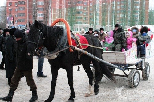 С утра туда уже стекался народ, чтобы поглазеть на весёлое представление озорных артистов, разыгрывавших сценарий проводов зимы и встречи весны, поесть блины – непременный атрибут масленицы. Кстати, блины – символ солнца, которое всё ярче разгоралось, удлиняя дни. Детей катали на санях, запряжённой лошадью, развлекали всевозможными изделиями народных промыслов. А для взрослых был придуман свой способ развлечения – для самых смелых и ловких на площади был установлен высокий столб с ценными подарками на верху. Тот, кто не побоялся в зимний холод раздеться и сумел залезть на скользкий столб, ушёл домой с призом. Традиционно праздник завершался сожжением чучела Масленицы.