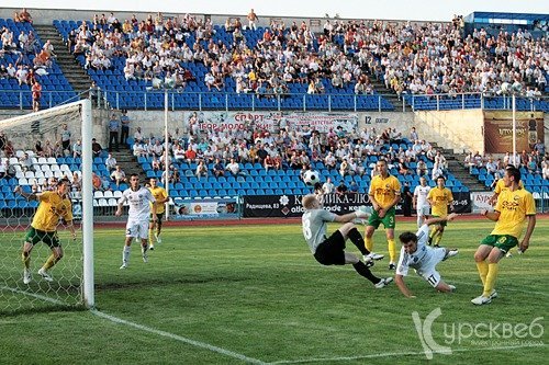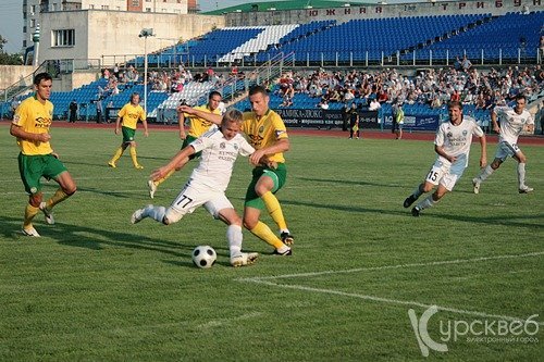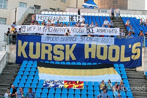 Куряне первые 30 минут явно доминировали на поле, играя в атакующий комбинационный футбол. Подстать местным футболистам были и фанаты команды, подготовившие к этому поединку целую серию красочных плакатов, один из которых гласил: "Приказано выжить". Яркие полотна растянули и болельщики краснодарской команды, которых набралось около 30 человек.