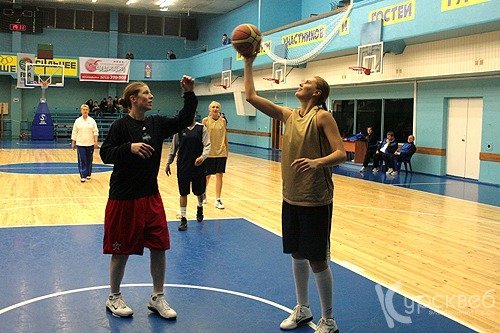 Завершила открытую тренировку двусторонка - команда "светлых" (Ксения Лаптева, Наталья Краснощек, Ирена Визбариене, Светлана Максименко, Анастасия Бочарова) против "темных" (Кэтти Смит, Линдсей Хардинг, Екатерина Нечепаева и две Натальи - Мелентьева и Гвоздева). Обе команды проводили атаки "три в два". У "темных" при поддержке Хардинг и Смит на ударную позицию выходили Гвоздева и Мелентьева. Чаще мяч в корзину закладывала первая Наталья, последний раз появлявшаяся на паркете в домашнем матче премьер-лиги против новосибирского "Динамо-ГУВД". У "светлых" под активным американо-российским прессингом "темных" зачинали атаки Лаптева и Бочарова, а завершающий бросок чаще делали Максименко и Краснощек. Двусторонка проходила очень живо, настолько, что в пылу борьбы Екатерина Нечепаева, отбирая мяч, нечаянно ударила Ирену Визбариене. К счастью, все обошлось без травмы, но литовскую центровую на паркете заменила Анастасия Колотильщикова.